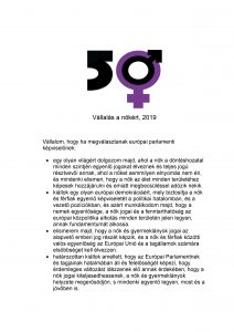Az Európai Női Lobbi, tagszervezeteivel, többek között a Magyar Női Érdekérvényesítő Szövetséggel közösen készítette el az Európai Parlament 2019-2024-es ciklusára vonatkozó nőjogi kiáltványát. A kiáltványt, amely magyarul honlapunkon olvasható, eljuttattuk a magyar politikai pártok vezetőihez is. Európai szövetségünk kapcsolódó nőjogi vállalását az EP-választás napjáig 18 magyar EP képviselőjelölt írta alá. A következő parlamenti ciklusban is figyelemmel fogjuk kísérni, hogy a pártok ígéretük fényében mit tesznek azért, hogy a nők és a férfiak valós társadalmi egyenlőségének megvalósuljon és a nők jogai teljes körűen érvényesülhessenek.