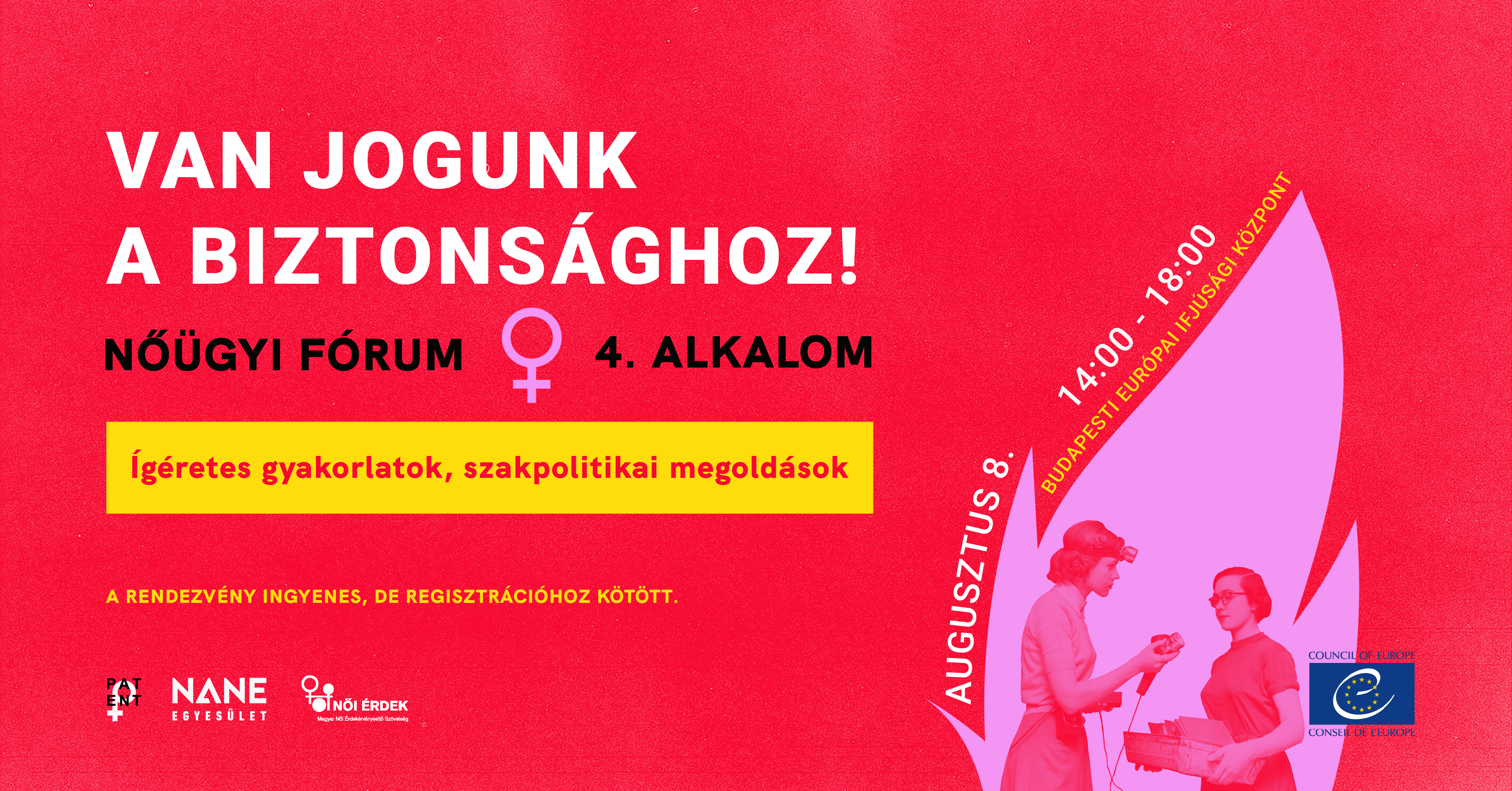 A Magyar Női Érdekérvényesítő Szövetség, a NANE Egyesület és a PATENT Egyesület tisztelettel meghívja a Van jogunk a biztonsághoz! Ígéretes gyakorlatok, szakpolitikai megoldások című szakmai programjára. Időpont: 2023. augusztus 8. 14:00 – 19:30Helyszín: Budapesti Európai Ifjúsági Központ (European Youth Centre Budapest) 1024 Zivatar utca 1. – BC terem A nők elleni erőszak valamint a párkapcsolati és